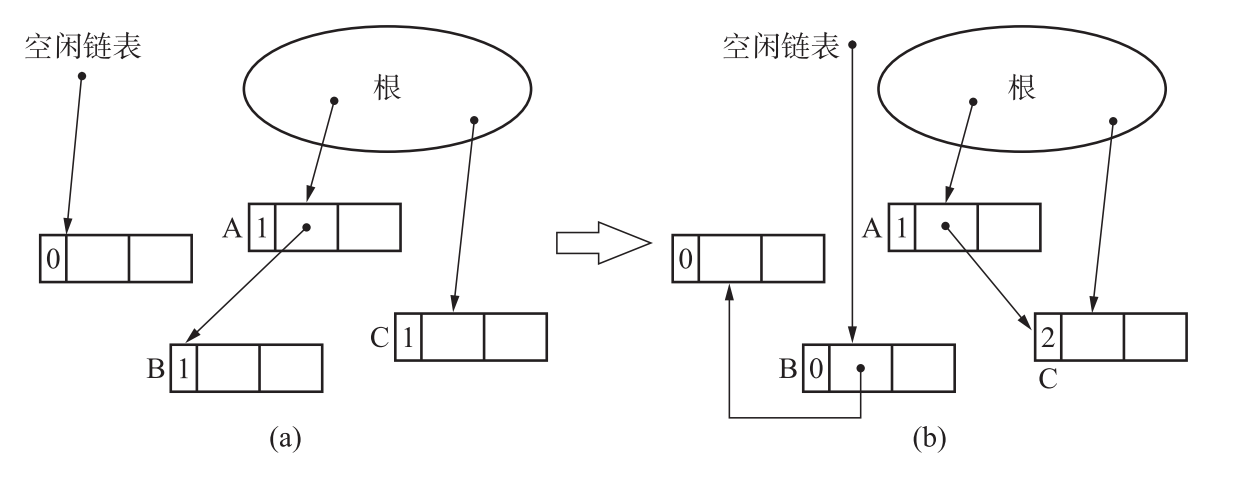 上图示例中,删除根到A的引用,执行完def_ref_cnt函数后,堆的状态如下。