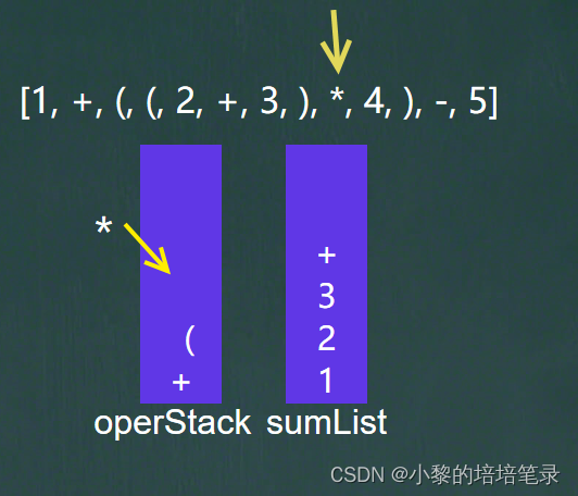 然后继续进行遍历放入数据和符号,如果是符号,就与符号栈的栈顶的符号进行比较,要放入运算符的运算级如果小于等于栈顶运算符的运算级,就将栈顶的运算符放入集合中,但下面的图中,运算符为括号,所以不用管,因为括号有单独的判断条件,所以直接放入。