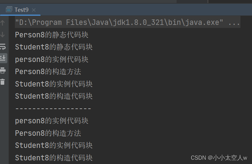 class Person8{ int age; String name; static { System.out.println("Person8的静态代码块"); } { System.out.println("person8的实例代码块"); } public Person8() { System.out.println("Person8的构造方法"); } } class Student8 extends Person8{ boolean sleep; static { System.out.println("Student8的静态代码块"); } { System.out.println("Student8的实例代码块"); } public Student8() { super(); System.out.println("Student8的构造代码块"); } } public class Test9 { public static void main(String[] args) { Student8 stu = new Student8(); System.out.println("------------------"); Student8 stu2 = new Student8(); } }