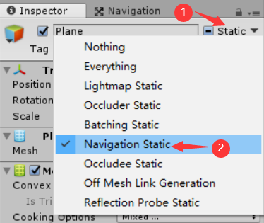 选中地面、斜坡、台阶、路障等静态对象,将 Static 属性设置为 Navigation Static,如下:
