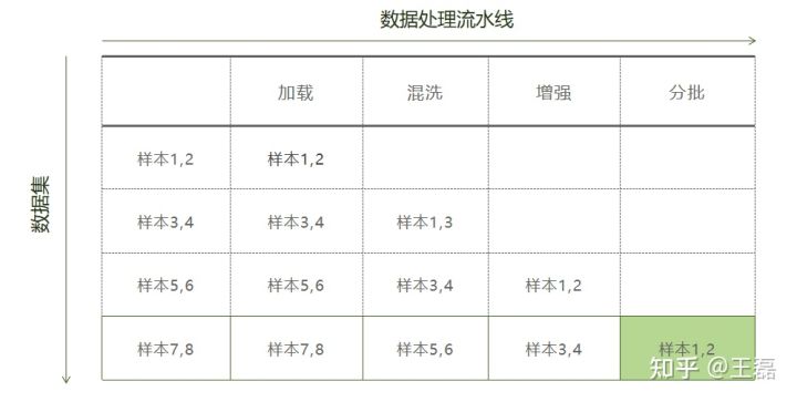 流水线(Pipeline)模式是一种数据处理模式,它将整个数据处理的过程分为多步,以流水线方式处理数据,同时在每个阶段都进行并行处理,实现高效的数据处理。以下图为例,我们将数据处理的过程分为加载、混洗、增强和批量操作,形成一个数据处理的管道,每个管道中都以并行的方式处理样本数据,从而实现流畅高效的数据处理。