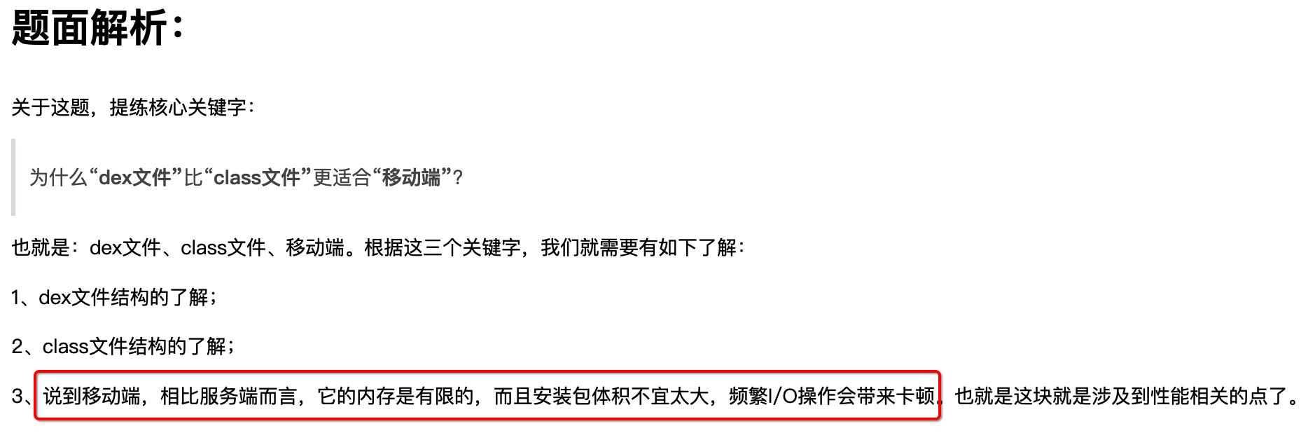 答:说到移动端,相比服务端而言,它的内存是有限的,而且安装包体积不宜太大,频繁I/O操作会带来卡顿,而对于dex相比class刚好它的优势就这三点【接下来则说出证据,也就是class文件和dex文件对比区别的那一段】: