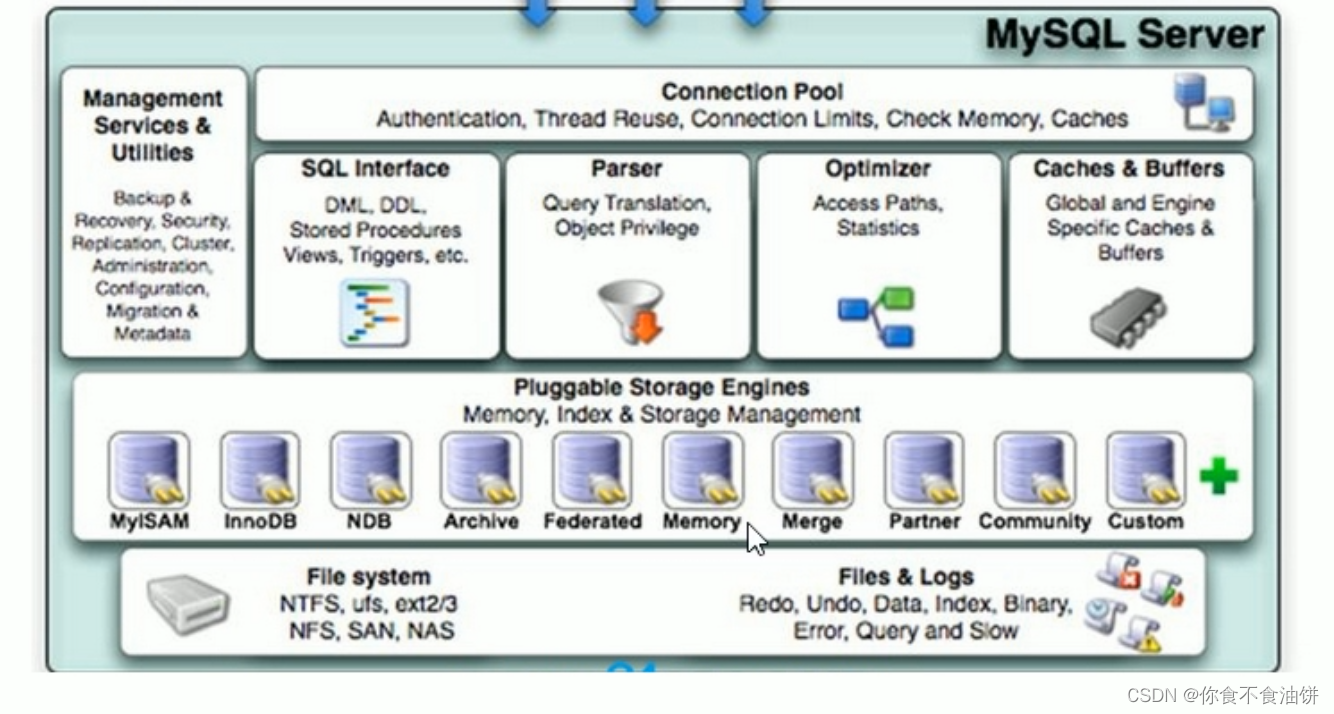 存储引擎层,存储引擎层真正负责了MySQL中数据的存储和提取,服务器通过API与存储引擎进行通信。不同的存储引擎具有的功能不同,这样我们可以根据自己的实际需要进行选取。