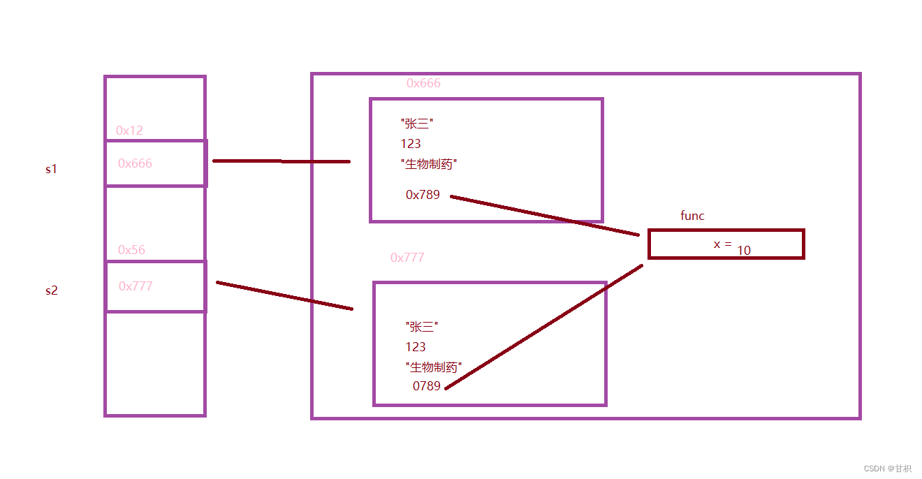 这里可以看到,s1中的func和s2中的func是一样的,都是一块地址,所以指向同一块空间,所以当s1中的func中的数据改变,s2中的数据也会随之改变