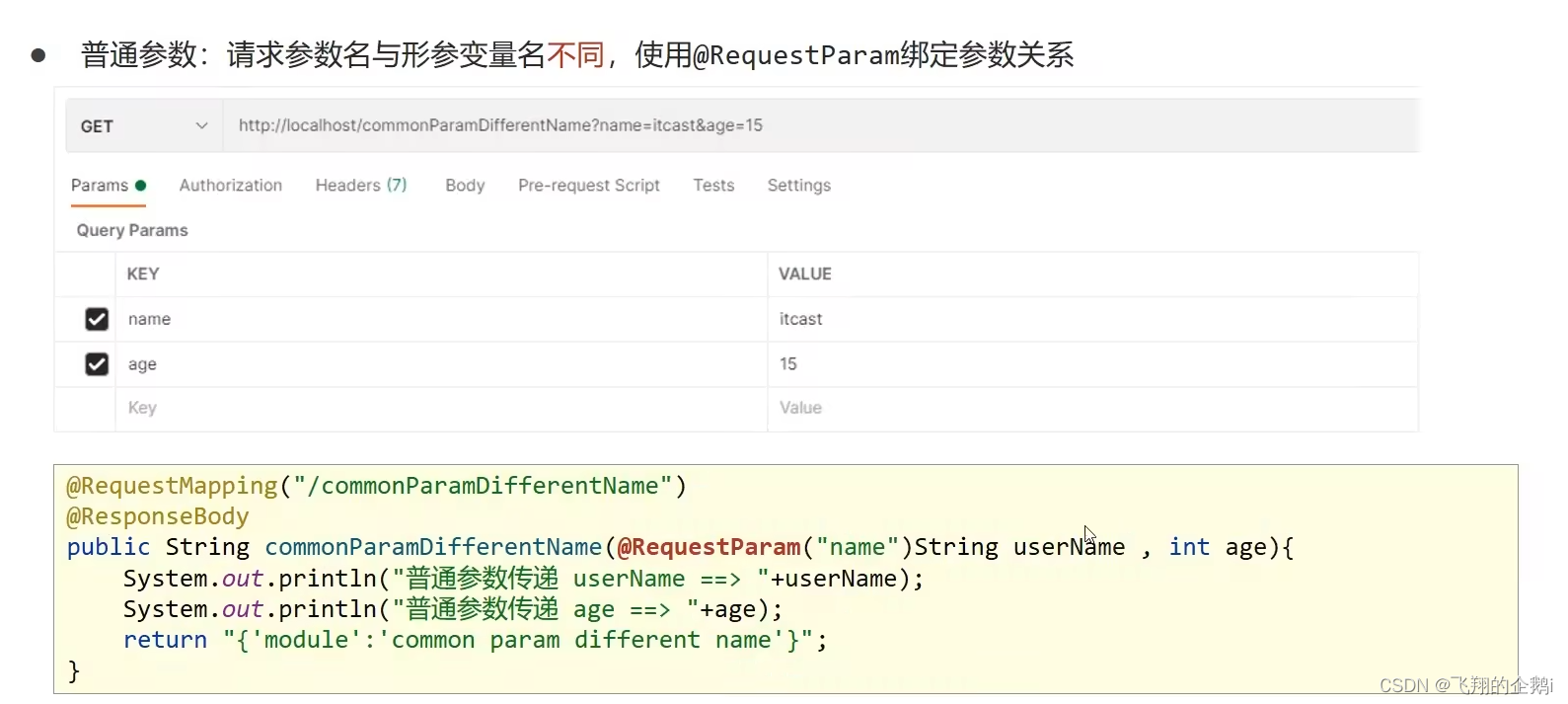 方法参数内部使用了@RequestParam注解将请求参数名称与方法参数名称绑定