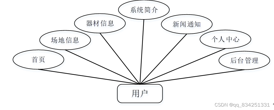 (b) 用户;进入系统可以实现首页、场地信息、器材信息、系统简介、新闻通知、个人中心、后台管理等功能。用户用例图如图