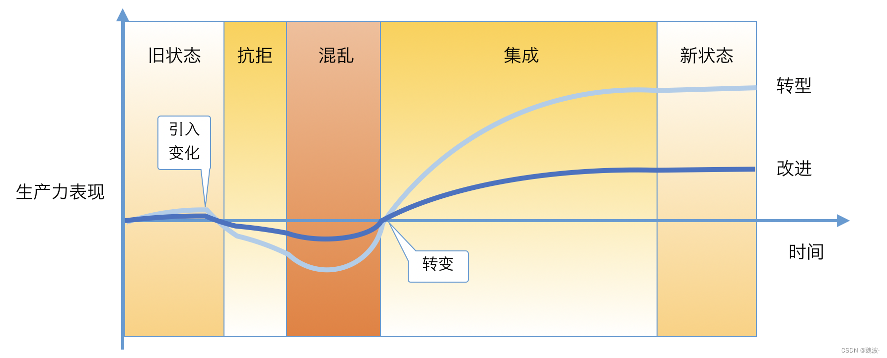 大家很可能认为“转型”是短时间内的巨大改变/变革。如果拿两个时间间隔较长的观测点来看是“转型”,但是把这个变化细分到每一天就是“改进”,这也更加符合DevOps的精神---持续改进。一个事物在旧状态下突然引入变化,会经历4个时期:抗拒期、混乱期、集成期、新状态期。这也符合萨提亚改变模型: