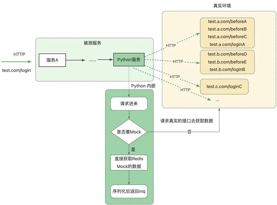 基于数据存储中间件的 Mock 方案其实是在被测服务中加入 Mock 逻辑,当启用 Mock 时,直接从 Redis 获取数据,而不去请求真实的数据,这就实现了 Mock 的目的。