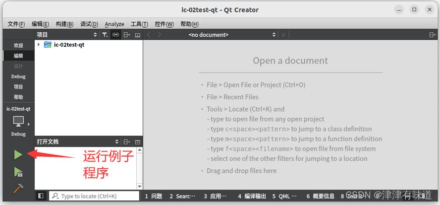 选择我们提供的例子代码文件夹ic-02test-qt-linux-amd64\ic-02test-qt,打开ic-02test-qt.pro项目文件,然后