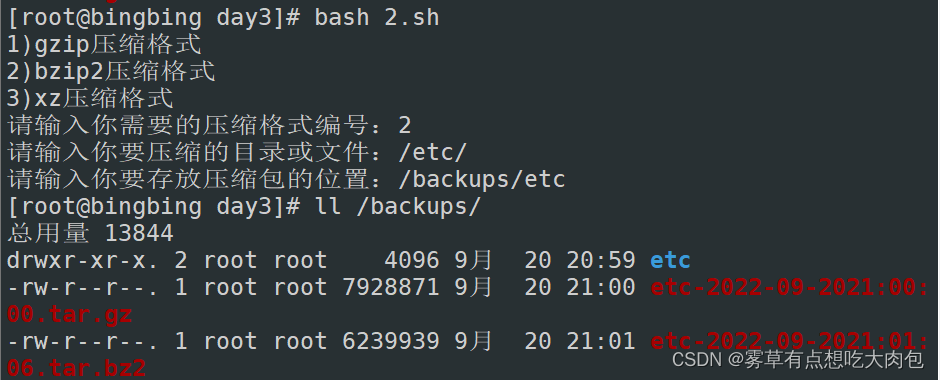 (2) 如果参数1的值为bzip2,则使用tar和bzip2归档压缩/etc目录至/backups目录中,并命名为/backups/etc-20160613.tar.bz2; j