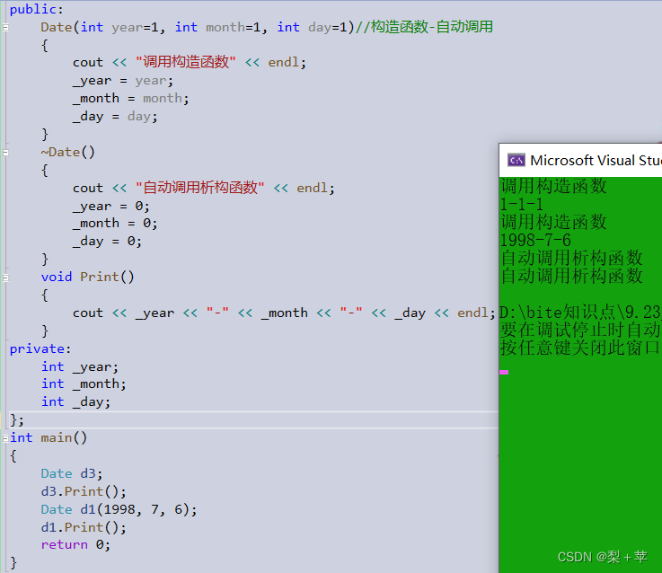 class Date { public: void Init(int year, int month, int day) { _year = year; _month = month; _day = day; } void Print()// 等同于Print(Date*this)-(Date*d1)/(Date*d2) { cout << _year << "-" << _month << "-" << _day << endl; } private: int _year; int _month; int _day; }; int main() { Date d1; Date d2; d1.Init(1988, 11, 29); d1.Print(); d2.Init(1997, 10, 8); d2.Print(); return 0; }
